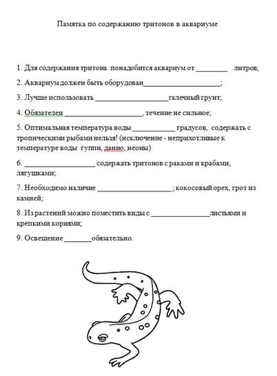 Задание: Заполнить памятку по содержанию тритонов в аквариуме (Приложение 3).