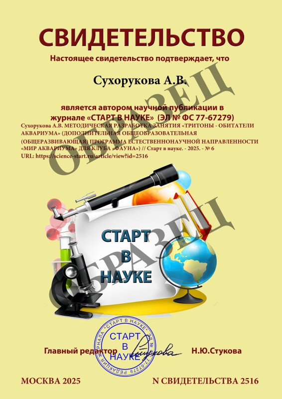 Сухорукова А.В. МЕТОДИЧЕСКАЯ РАЗРАБОТКА ЗАНЯТИЯ «ТРИТОНЫ - ОБИТАТЕЛИ АКВАРИУМА» (ДОПОЛНИТЕЛЬНАЯ ОБЩЕОБРАЗОВАТЕЛЬНАЯ (ОБЩЕРАЗВИВАЮЩАЯ) ПРОГРАММА ЕСТЕСТВЕННОНАУЧНОЙ НАПРАВЛЕННОСТИ «МИР АКВАРИУМА» ДЛЯ КЛУБА «ФАУНА») // Старт в науке. 2025. № 6. ;URL: https://science-start.ru/ru/article/view?id=2516 (дата обращения: 04.12.2025).