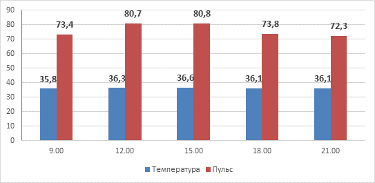Из представленных данных видно, что самые высокие температура и пульс приходятся на 15.00. Из этого следует, что мой хронотип – Голубь.
