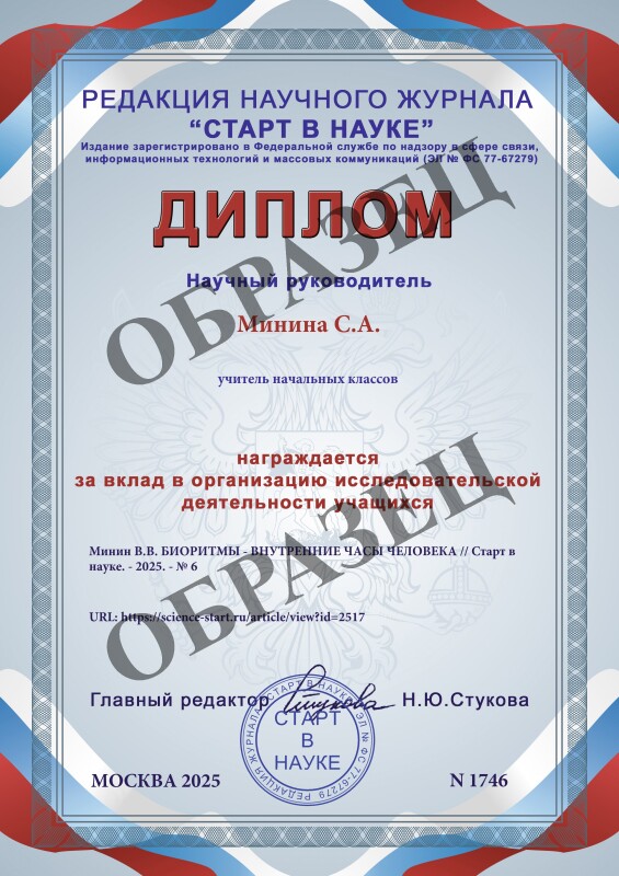 Минин В.В. БИОРИТМЫ - ВНУТРЕННИЕ ЧАСЫ ЧЕЛОВЕКА // Старт в науке. 2025. № 6. ;URL: https://science-start.ru/ru/article/view?id=2517 (дата обращения: 04.12.2025).