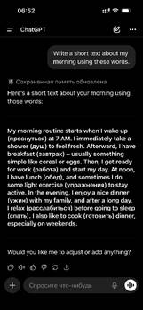 3. Создание рассказа с помощью нейросети:«Write a short text about my morning using these words».