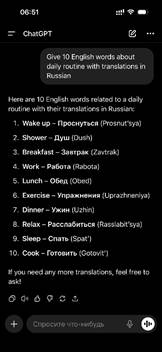 1. Запрос к ChatGPT:«Give 10 English words about daily routine with translations».