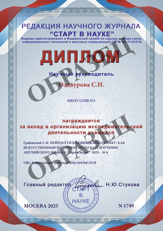 Грабовский С.И. НЕЙРОСЕТИ В ПОМОЩЬ ШКОЛЬНИКУ: КАК ИСКУССТВЕННЫЙ ИНТЕЛЛЕКТ ОБЛЕГЧАЕТ ИЗУЧЕНИЕ АНГЛИЙСКОГО ЯЗЫКА // Старт в науке. 2025. № 6. ;URL: https://science-start.ru/ru/article/view?id=2518 (дата обращения: 04.12.2025).