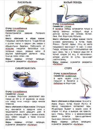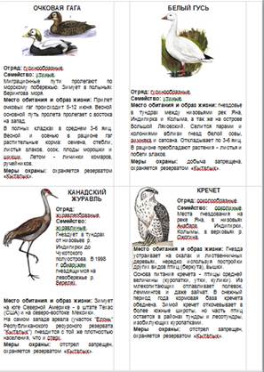 Птицы: Белоклювая гагара Черная казарка Розовая чайка Клактун Грязовик Пискулька Сибирская гага Стерх Белый гусь Канадский журавль Кречет |