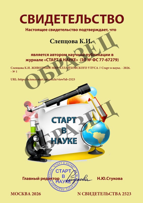 Слепцова К.И. ЖИВОТНЫЙ МИР АЛЛАЙХОВСКОГО УЛУСА // Старт в науке. 2026. № 1. ;URL: https://science-start.ru/ru/article/view?id=2523 (дата обращения: 05.02.2026).